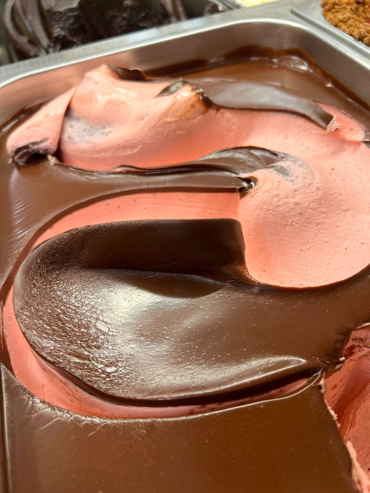 Gelato de morango com creme de gianduia.